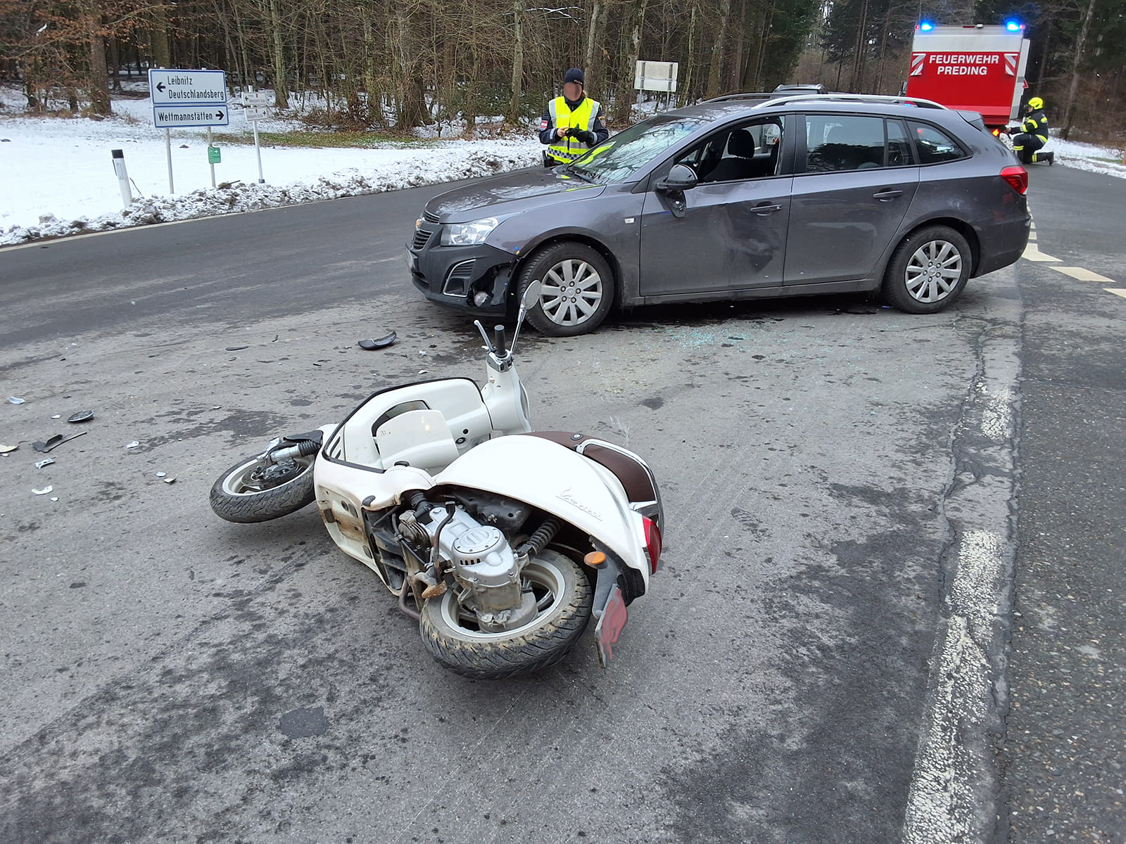 Am späten Montagvormittag kam es auf der „Stainzer Kreuzung“ – der Abzweigung von der L639 Wohlsdorfer Straße zur L617 Wieselsdorfer Straße – zu einer Kollision zwischen einem Moped und einem Auto. Der Mopedlenker kam dadurch zu Sturz und wurde leicht verletzt, während der PKW-Lenker unverletzt blieb.