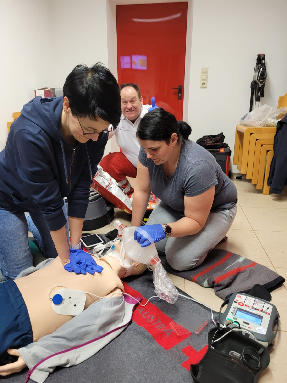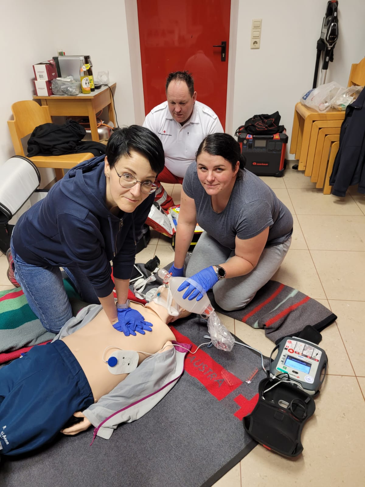 Im Fall der Fälle muss es schnell gehen: Eingeübte Handgriffe müssen gerade bei der Ersten Hilfe fehlerfrei im Einsatzfalle abgerufen werden können. Deshalb üben unsere Kameradinnen und Kameraden des Sanitätsdienstes dies auch regelmäßig. So auch am vergangenen Montag, als gemeinsam mit dem Predinger First Responder des Roten Kreuzes, Andreas Zmugg, speziell die Reanimation, Intubation, Beatmung und Handhabung des Defibrilators geübt wurde.