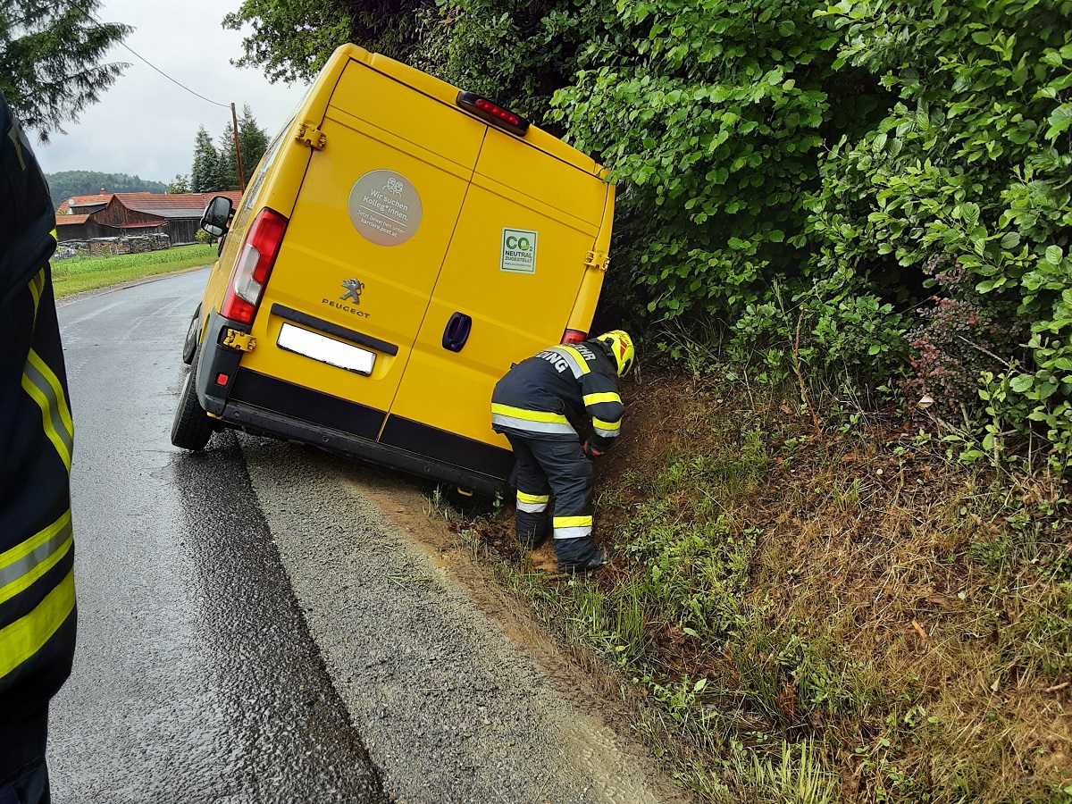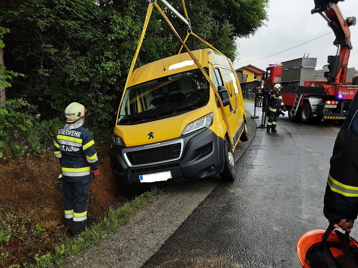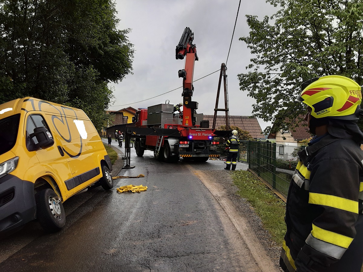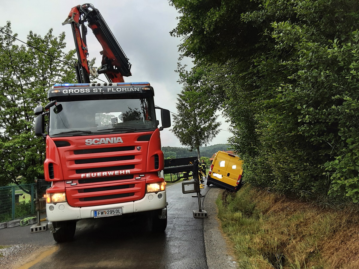 Da die Bergung des verunfallten Fahrzeuges mit eigenen Mittel nicht möglich war, wurde die FF Groß Sankt Florian mit ihrem Kranfahrzeug nachalarmiert.
