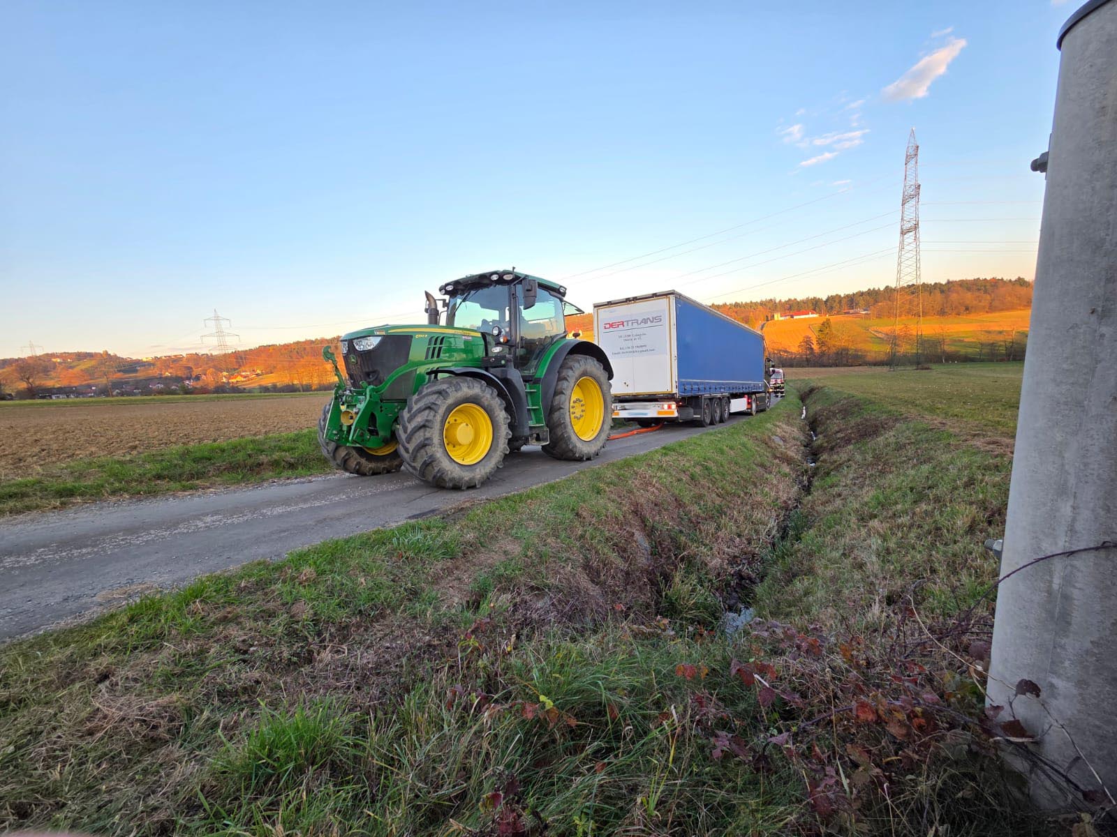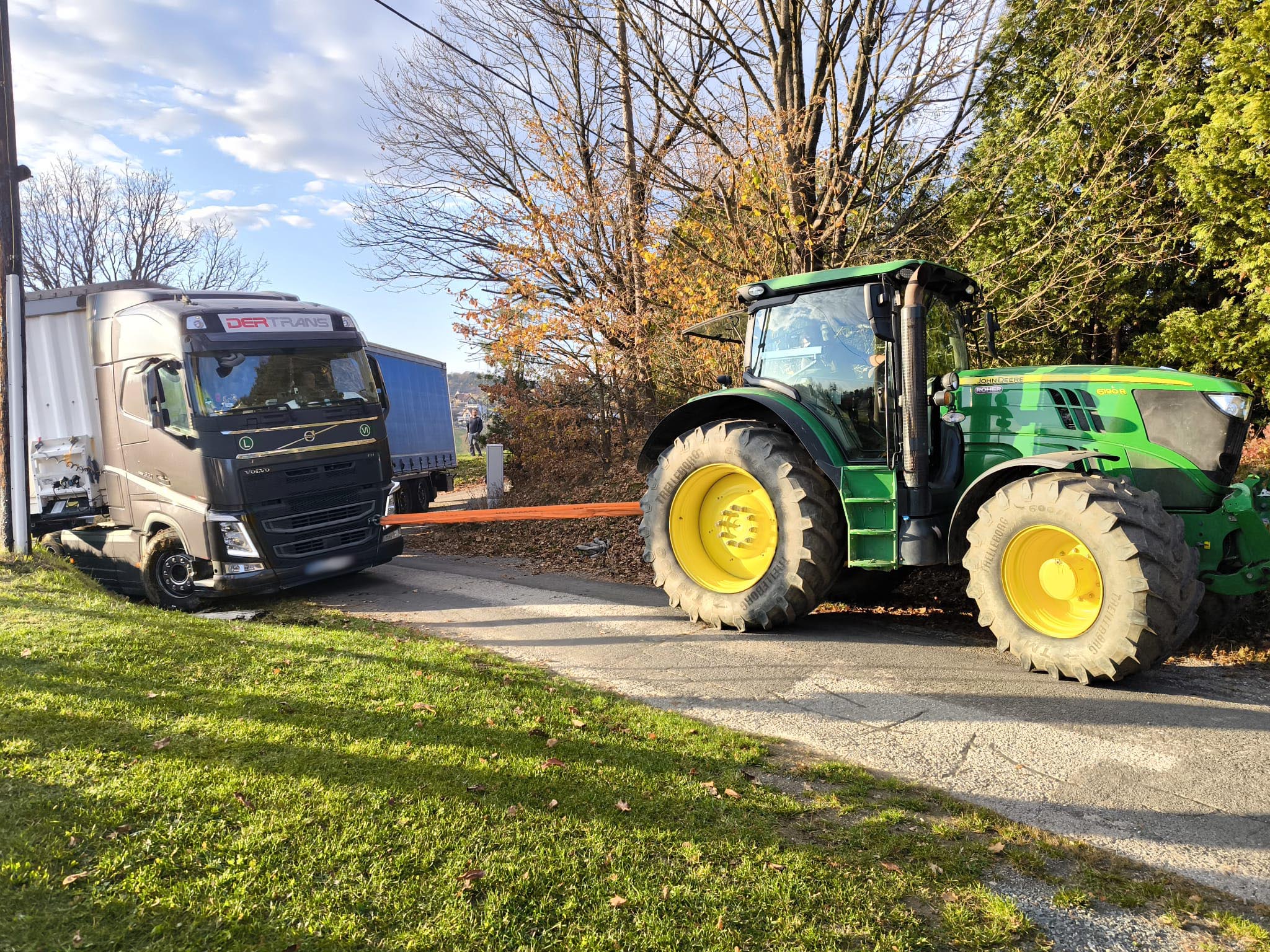 Danach folgte ein Spießrutenlauf zurück zur Bundesstraße L303: Rund 600 Meter musste der Sattelschlepper im Rückwärtsgang die schmale Straße zunächst bergab, danach wieder bergauf zurücklegen. Dabei war der Anstieg hinauf zur Bundesstraße zu steil für das Gespann: So musste neuerlich der Traktor des Kameraden mithelfen, um den Lkw wieder flott zu bekommen. Am Ende gelang es aber – nicht zuletzt auch dank der Fahrkünste des Lkw-Lenkers!! – das Fahrzeug wieder „auf die Bundesstraße zu stellen“.