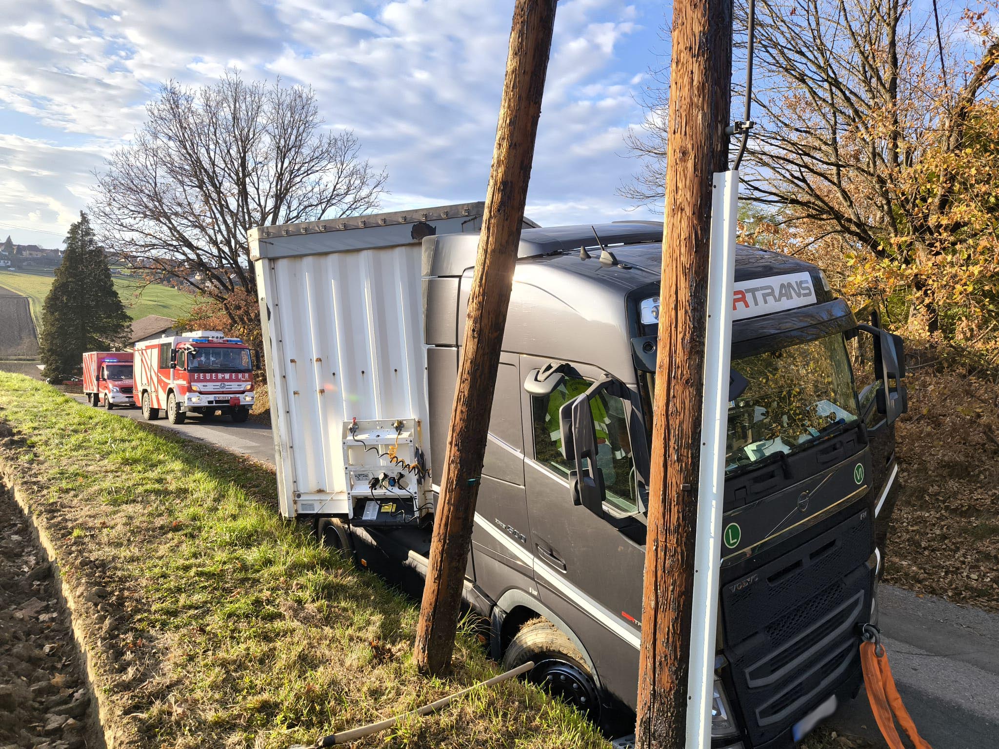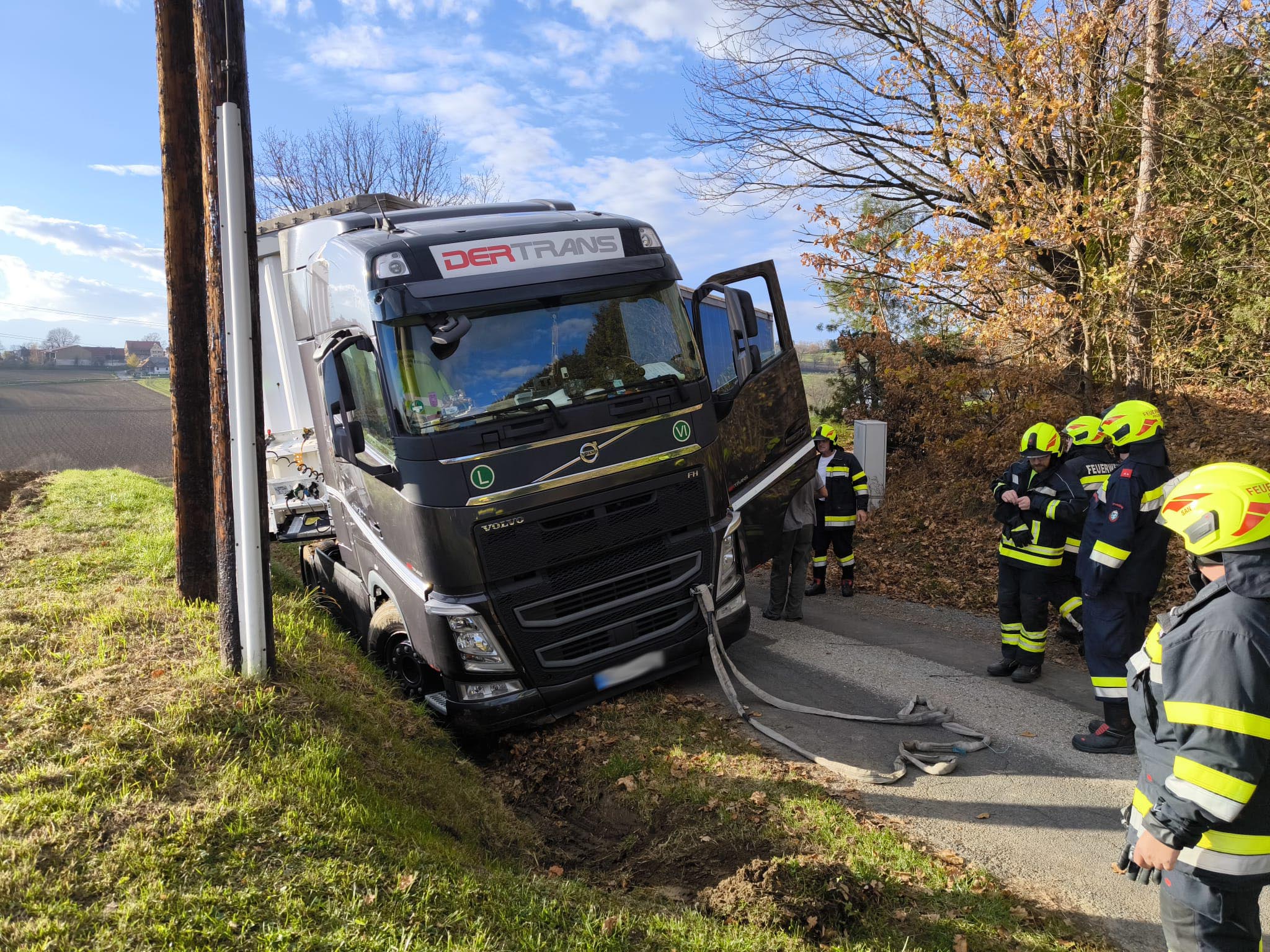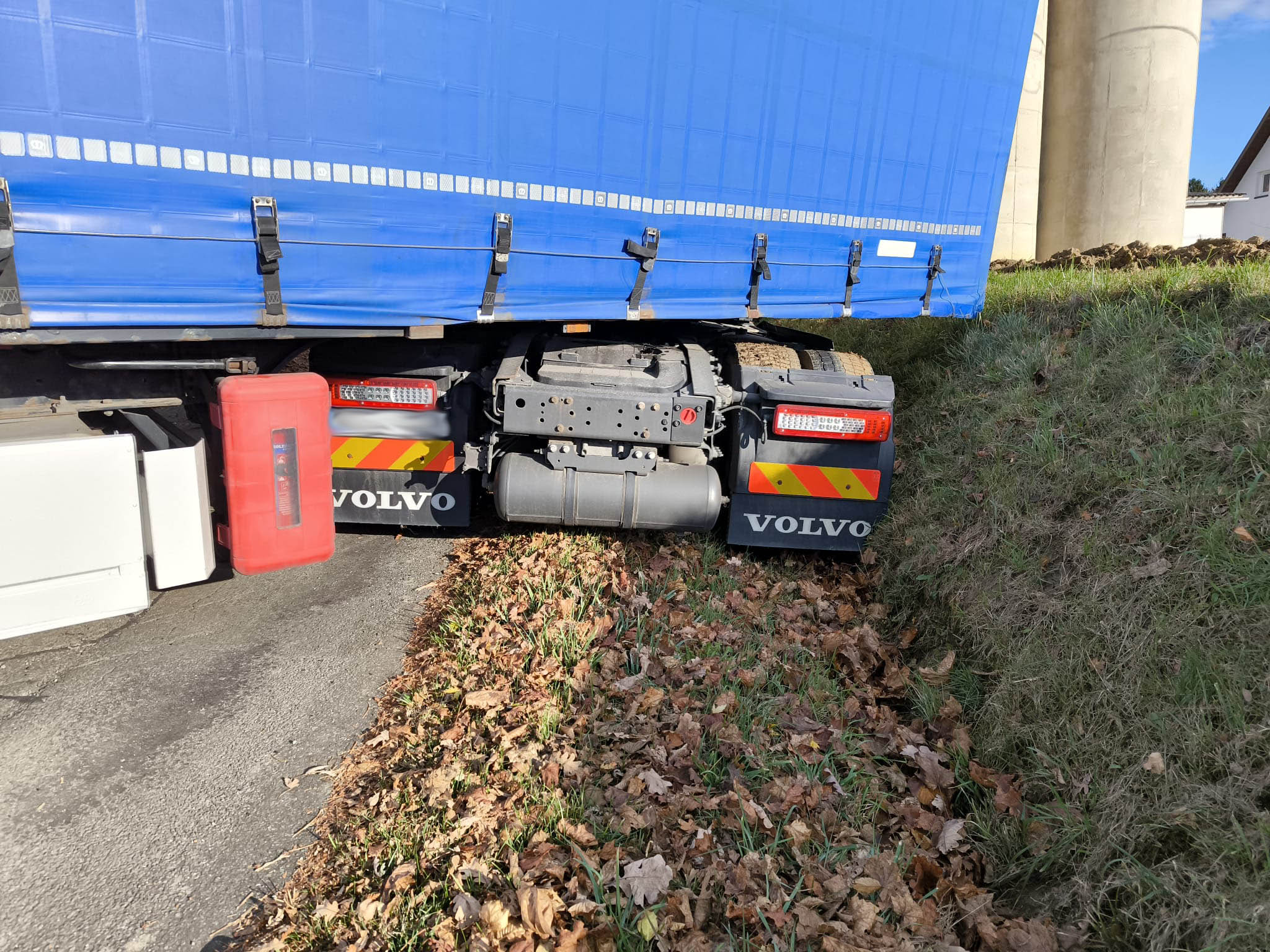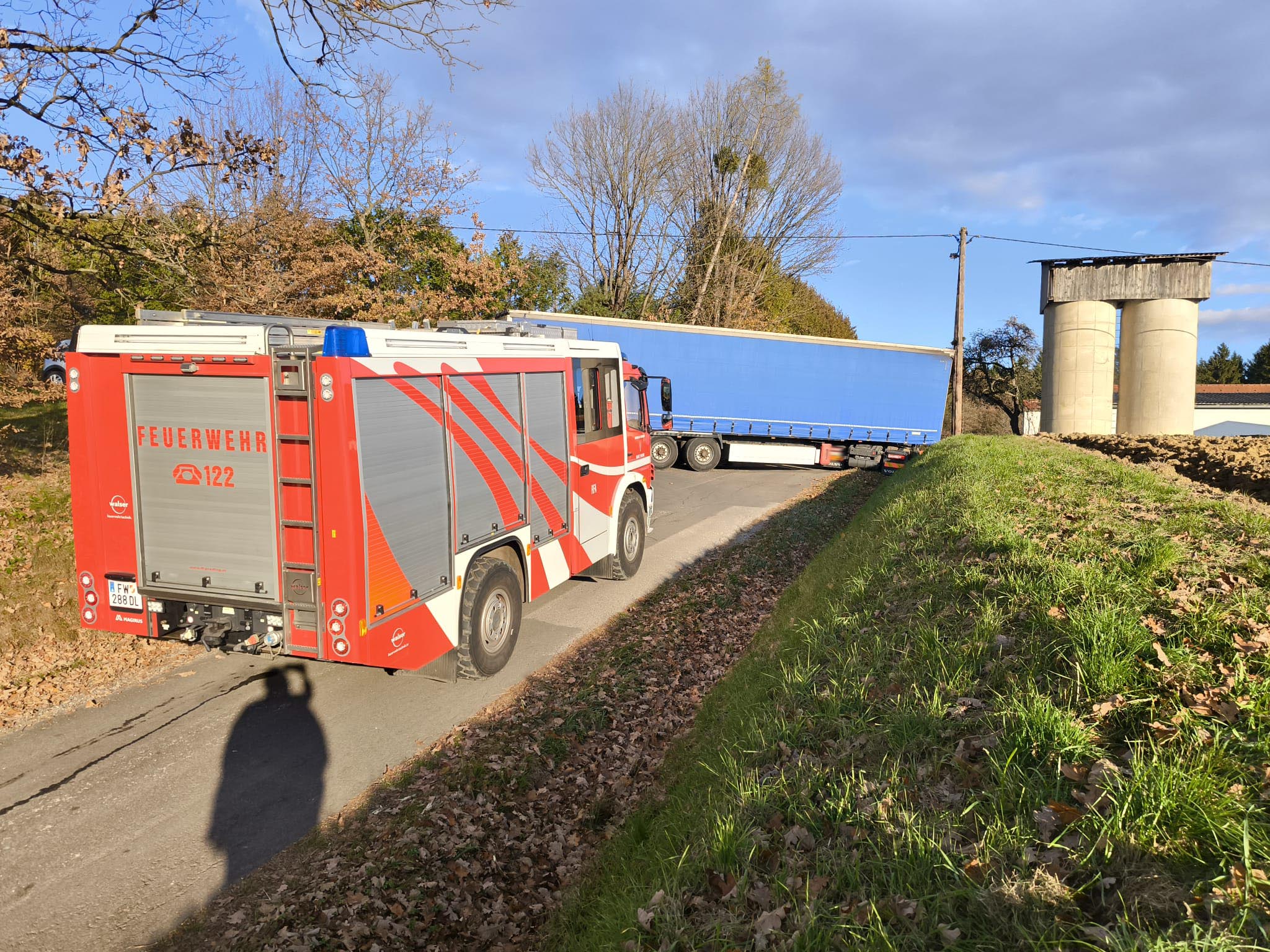 Ein nicht ortskundiger Lenker eines Sattelschleppers vertraute zu sehr auf sein Navigationsgerät: Das eigentliche Ziel war ein großer Industriebetrieb in Preding. Sein Navi hingegen lotste den Mann auf eine mehr als schmale Gemeindestraße in den Ortsteil Preding-Alm, die noch dazu in einem für Lkw unpassierbaren Waldweg endet. Als der Lenker dies bemerkte, versuchte er, sein Fahrzeug in eine ebenfalls sehr schmale Seitenstraße zu reversieren. Das abschüssige Gelände lieferte seinen Beitrag, und so endete die Zugmaschine im Straßengraben: Bewegung nach vorne und zurück unmöglich.