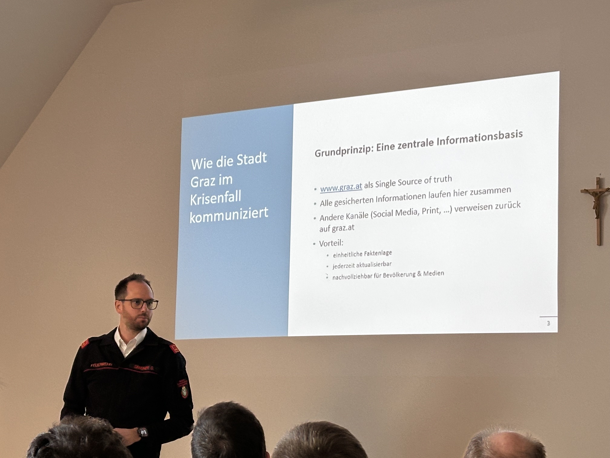 Abschnittsbrandinspektor DI (FH) Hans Jürgen Ferlitsch erläuterte die Grundlagen der Krisenkommunikation, während Brandinspektor Gregor F. Waltl die Arbeitsweise von Journalisten näherbrachte. Mag. Gilbert Sandner, MSc, gab zudem Einblicke in die behördliche Krisenkommunikation und Zusammenarbeit.